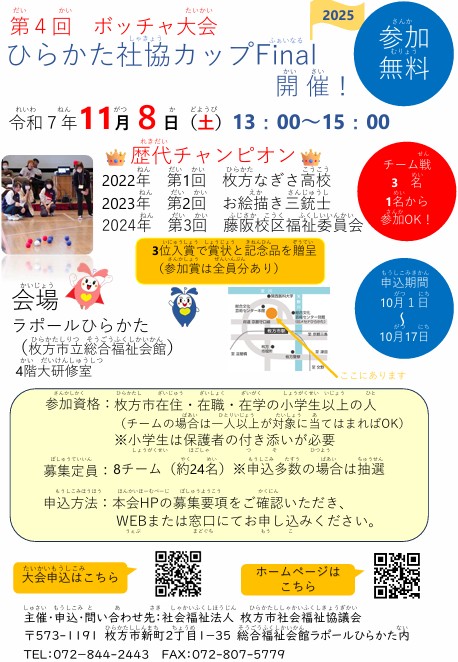 第14回ひらかた社協ふくしフェスティバルで行われる 第4回 ボッチャ大会「ひらかた社協カップFinal」の詳細が決定しましたので、ご案内いたします。