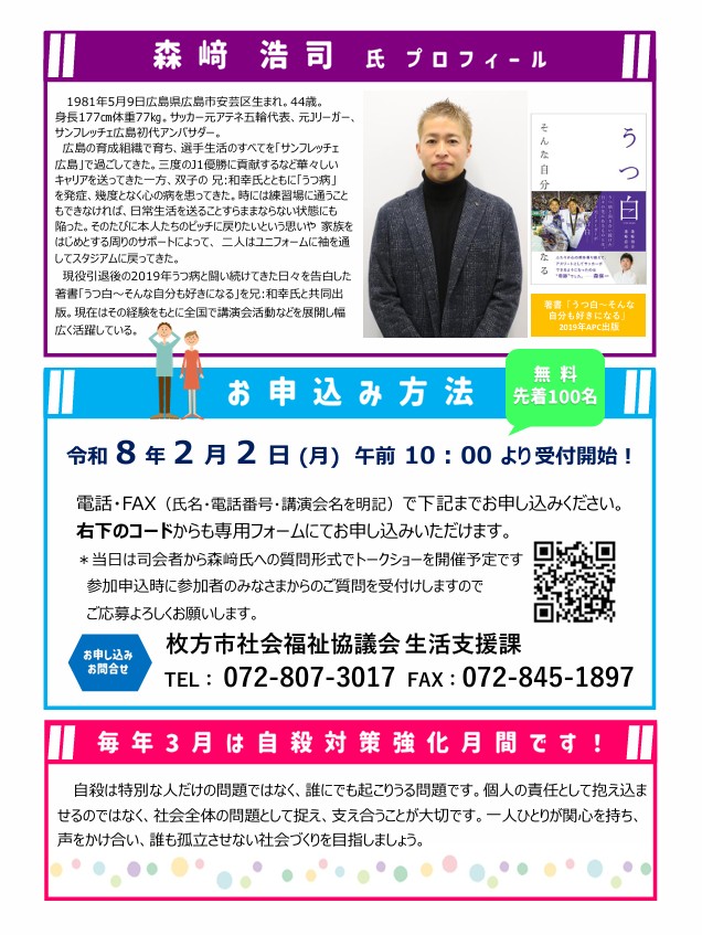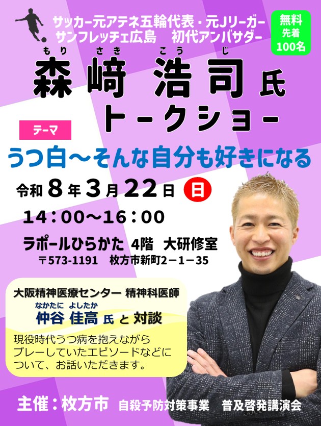 令和7年度「自殺予防対策事業 普及啓発講演会」を開催いたしますのでお知らせいたします。                                                                    毎年3月は自殺対策強化月間です。「うつ白~そんな自分も好きになる~」をテーマにサッカー元アテネ五輪代表・元Jリーガーの森﨑浩司さんをお招きしてご講演いただきます。                                当日は、大阪精神医療センター医師の仲谷佳高さんと対談予定です。