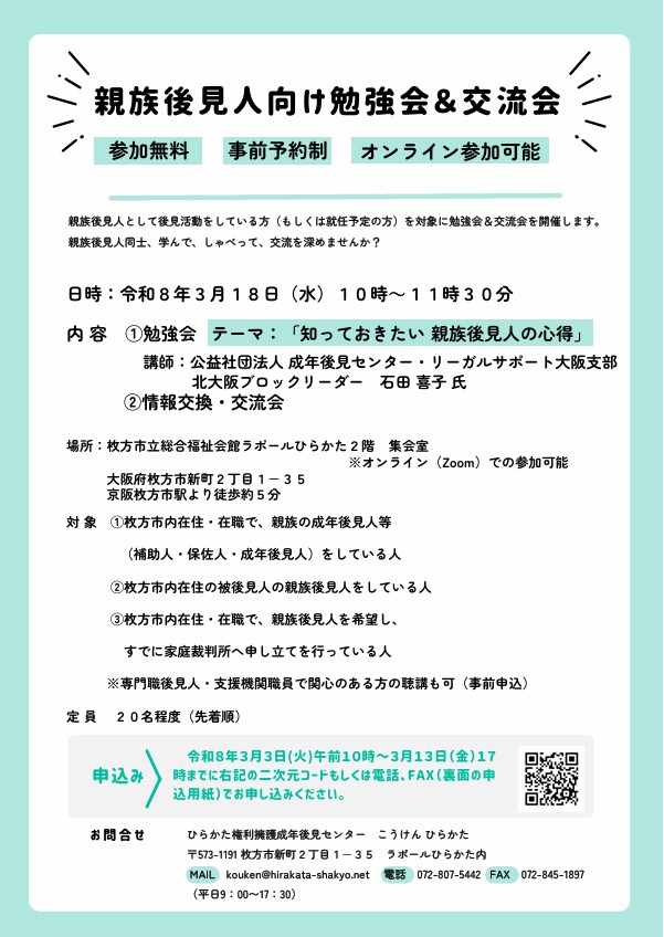 【3月18日(水)開催!ひらかた権利擁護成年後見センター「こうけん ひらかた」より勉強会ならびに交流会のご案内】