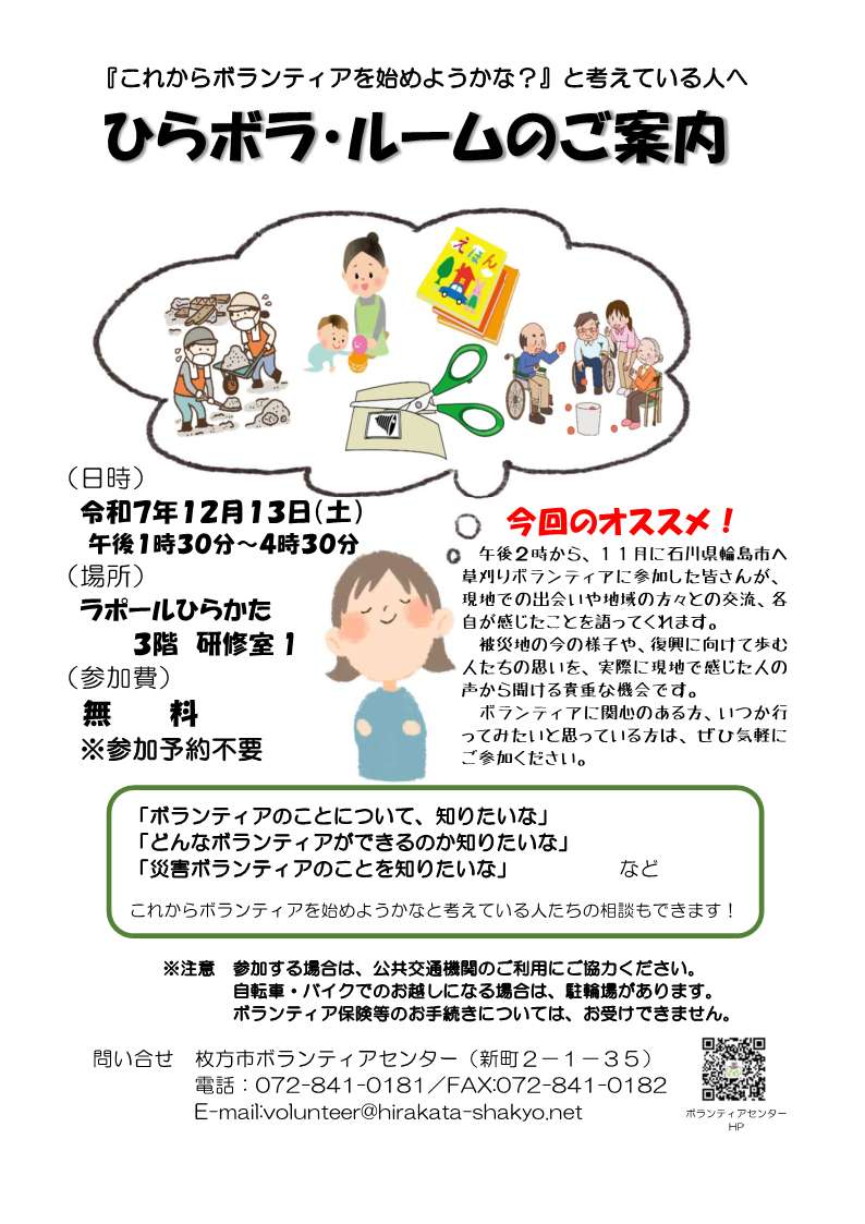 ひらボラ・ルームは、ボランティア活動に『興味がある』、『活動をしてみたい』、『どのような活動があるか知りたい』など、考えている人に向けた企画です。